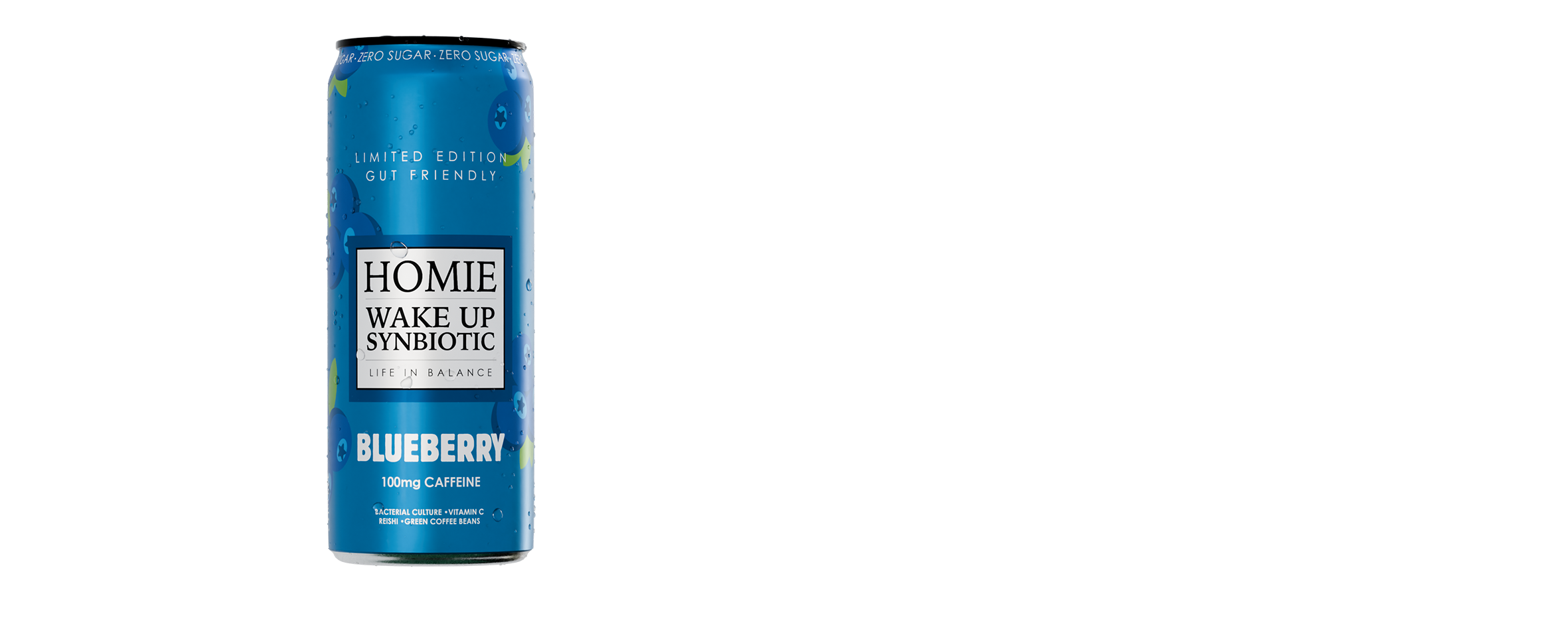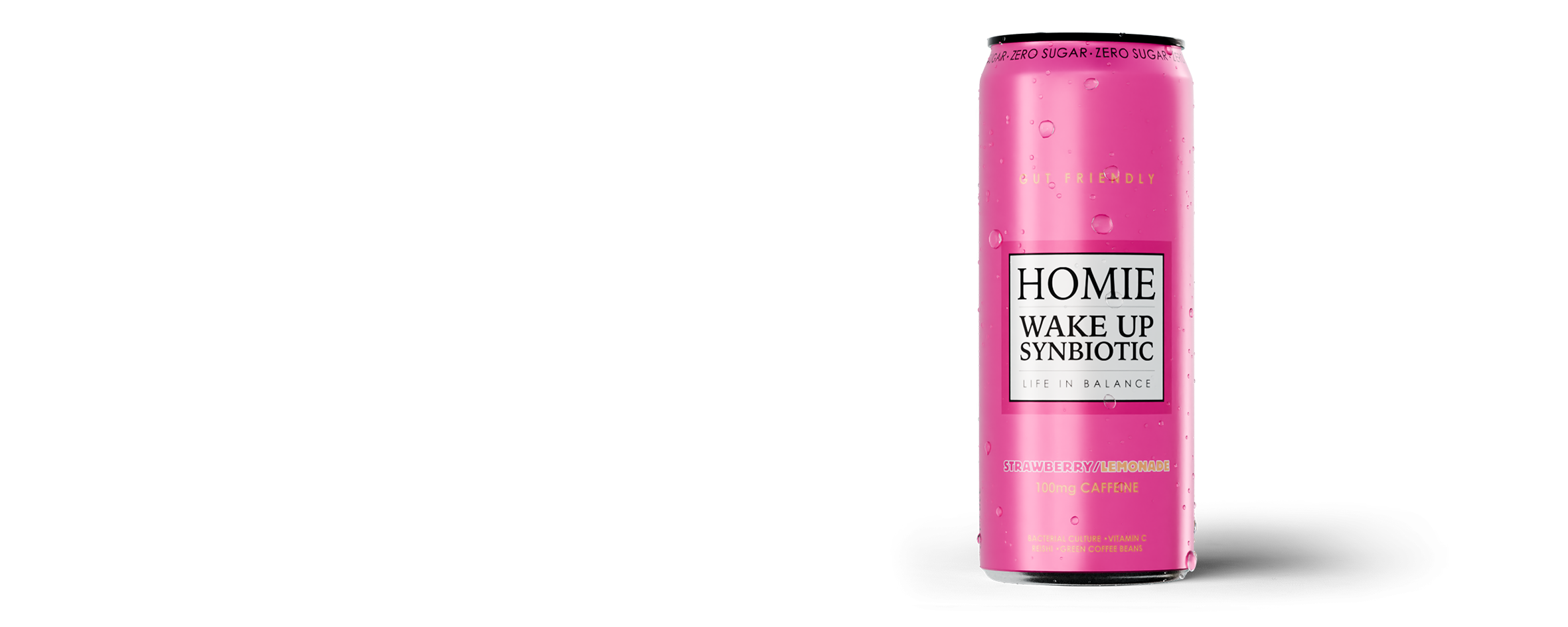 är en kolsyrad dryck med koffein, levande bakteriekultur, reishi, cikoriarot samt utvalda vitaminer och mineraler. Med smak av jordgubb och lemonad.